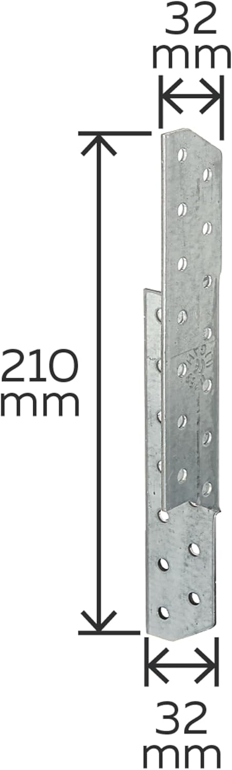 Connecting bracket, leftLarge Packof galvanised sheet steelWith CE markingSpecifications:Width: 32 mmDepth: 32 mmHeight: 210 mmMaterial thickness: 2.0 mmNumber of holes: 28Hole-diameter: 5.0 mm